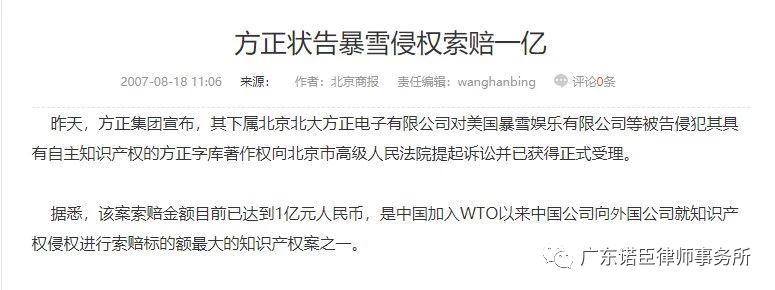 2007年,因暴雪娱乐开发的网络游戏《魔兽世界》中,使用了北大方正的方正兰亭字库字体,但未获得北大方正的合法授权,《魔兽世界》是一款付费游戏,在中国市场销售后为暴雪公司带来了巨额的创收。北大方正认为,暴雪公司行为侵犯了北大方正对涉案字体美术作品著作权中的复制权、发行权、信息网络传播权及获得报酬权,于2007年6月18日向法院起诉,要求暴雪公司赔偿经济损失4.08亿元。