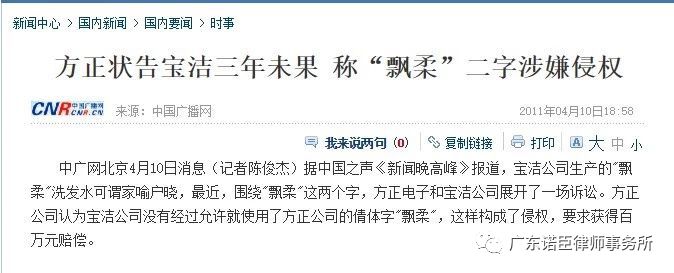 2008年北大方正认为宝洁公司的洗发水产品中 “飘柔”二字与北大方正倩体字库的笔画、笔数及汉字部件的位置关系一致,字体一致,设计风格和特征一致。
