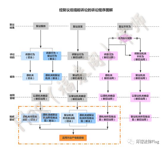 把复杂程序庖丁解牛,带你学习带你飞,是Flag(福来阁)律师团队一贯的风格!下面我们以一张神图,完美破解经复议行政行为引发诉讼时的司法程序。