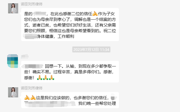 2023年7月初,双方确认调解协议,法院出具民事调解书,成先生顺利收到医方调解款项,案件经过一审、二审、重审一审一年多的历程,得到了完满解决,成先生对案件能获得如此结果感到非常满意,亦感叹我们工作的不易,并对我们表示谢意。