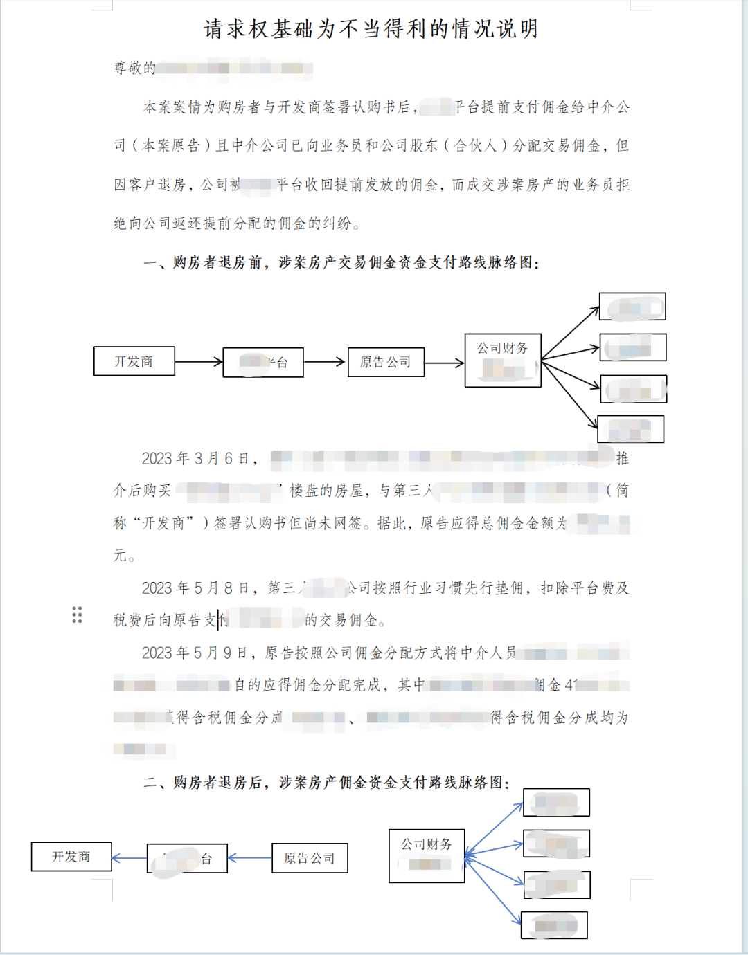 我所律师主张:因佣金取得的前提是交易最终完成,所以客户退房后,委托人收取佣金的法律基础已丧失;平台公司已通过抵扣委托人其他交易佣金的方式收回涉案款项,委托人实际遭受损失,前团队成员继续持有该笔佣金无事实及法律依据,构成不当得利,依法应当返还。