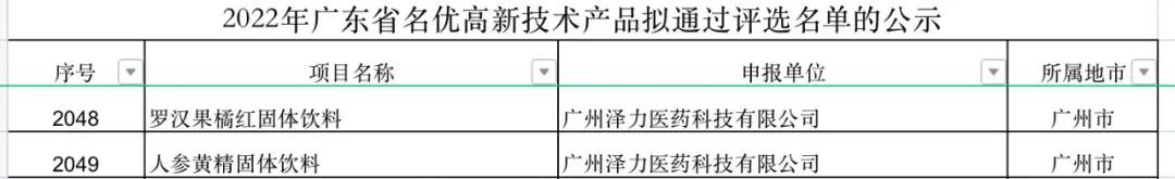 (2022年泽力旗下的两款抗疫产品:罗汉果橘红固体饮料及人参黄精固体饮料被评选为广东省名优高新技术产品)