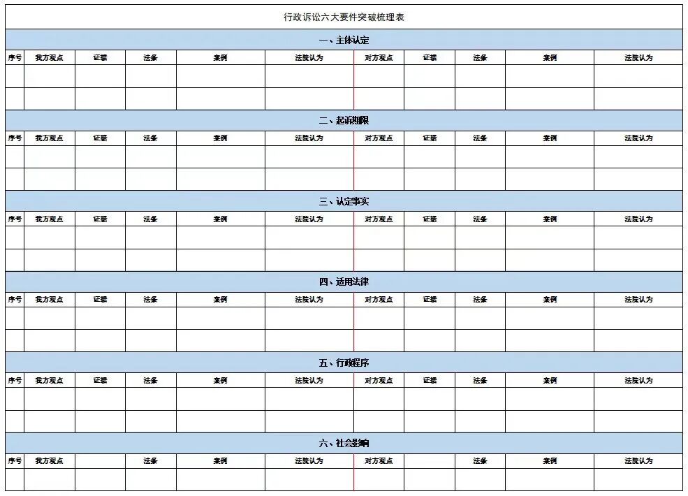 我们可以有效利用行政诉讼救济途径,借力行政机关的管理职权,极大地提高代理当事人维护合法权益的效率。例如,在民事相邻权诉讼中,如果被告的建筑物涉嫌违法建设的,原告就可以向行政机关投诉,对投诉处理不服则可以积极提起行政诉讼,通过行政诉讼推动行政机关依法履行查处违法建设的行政职责,完美实现原告相邻权民事诉讼胜诉的目的。那么,青年律师如何才能打一场漂亮的行政诉讼的呢?我们有一套自创“武功”,叫“66大顺”突破法。由于专注复杂土地争议行民交叉诉讼多年的原因,一开始团队律师接到一起行政诉讼时,经常是一脸懵逼,对着案卷材料无从下手,根本不知道寻找案件的突破口,说服客户签单,或者是让自己代理的案件反败为胜。经过多年摸索、总结和实践,我们独创了“66大顺”突破法,简单用一张excel表格就能轻松找到案件突破口,搞定诉讼。方法为:重点应当从主体认定、起诉期限、认定事实、适用法律、行政程序、社会影响等“六大要件”(简称“主体、时效、事实、法律、程序、影响”)去拆解一个案件。这是我们团队创始人宋静律师,经过多年摸索并实践出来的方法论。充分学习并利用“66大顺”突破法,就能让我们青年律师的诉讼效率事半功倍!下面就是“66大顺”突破法,一张excel表格的学习指南:当我们拿到一个案件材料后,第一件事就是制作一个空白的excel表格,在表格上按照顺序填写“六大要件”的名称,然后按照下列步骤梳理、查找、填写相关内容,最后把所有内容汇总,就能轻松形成一份诉状或法律意见书的框架和主旨了。拿到案卷材料后,第一步要找到案件中出现的所有主体,查看各主体是否符合法律规定,是否属于适格主体。行政诉讼中的主体认定,既包括原告资格的认定,也包括被告主体的认定。根据《中华人民共和国行政诉讼法》第二条“公民、法人或者其他组织认为行政机关和行政机关工作人员的行政行为侵犯其合法权益,有权依照本法向人民法院提起诉讼”的规定,行政诉讼原告资格的认定,最需要把握的一点就是,被诉行政机关或者公务人员的行为是否影响了原告的合法权益,行政诉讼法上成为原告和被诉行政行为是否具有法律上的利害关系。通俗来讲,就是被诉行政机关的行为是否造成了原告合法权益的损害。这种损害既可能是原告原有的合法权益被减损,如原告受到行政机关的行政处罚,造成原告的人身权益或者财产权益受损;也可能是原告依法本应当得到的权利而未能取得,如原告向行政机关申请颁发工商营业执照,行政机关不作为造成原告应当取得未取得以致无法开展经营;还可能是行政机关赋予其他人相关的权利,却影响了原告的合法权益,如行政机关在行政许可中准予他人某项许可,限制和影响了原告的公平竞争权等,都属于原告合法权益的减损。被告主体资格的认定,则是指原告在提起行政诉讼时应当找准被告。如果原告起诉指向的被告行政机关是错误的,就可能被人民法院驳回起诉。一般情况下,确定被告把握“谁行为谁当被告”的原则。即哪个行政机关作出了影响原告合法权益的行政行为,哪个行政机关应当作为被告,但行政职权的行使尚存在授权、委托、推定等多种复杂的情形。法律法规规章或者政府都可能授权具体的职能部门作出相应的行政行为,例如征收社会保险费的行政主体,既可能是人社部门,也可能是税务部门,需要根据各地政府的执法体制改革状况才能确定。不同行政机关还可能出现委托执法的情形,此时确定被告应当以委托机关为被告,受托机关也可以列为第三人。当行政诉讼的被告不明的情况下,则可能通过推定来确定行政诉讼的被告。例如,在行政强制拆除的诉讼中,原告有时没办法搞清楚究竟是哪个行政机关实施拆除的,就可以通过收集证据查明拆除前是否有行政机关作出过责令改正、征收公告或者收回土地等前置行为,可以推定作出前置行为的主体为实施强制拆除行为的被告。经过梳理,如果第一要件诉讼主体没有问题,那么我们开始进入第二要件,对案件所涉起诉期限开始梳理。看看自己在起诉期限上是否存在瑕疵,防止被对方一举翻盘,导致自己无法进入实体审理。行政诉讼的起诉期限和民事诉讼的诉讼时效有异曲同工之处,但又不尽相同。二者设置的目的是相同的,均为了督促原告积极行使诉权,“法律不保护在权利上睡觉的人”,但二者对于诉讼产生的影响是不同的。民事诉讼中原告的起诉如果已经超过时效,一方面被告不提异议的,人民法院不主动审查,而且时效问题只是影响原告的起诉是否能够胜诉,而行政诉讼中的起诉期限则不同,如果行政诉讼中原告的起诉超过起诉期限,人民法院对于原告的起诉即不予立案或者驳回起诉。虽然根据《最高人民法院关于行政诉讼证据若干问题的规定》第四条第二款“被告认为原告起诉超过法定期限的,由被告承担举证责任”的规定,似乎人民法院对于原告的起诉是否超过起诉期限不会主动审查,但行政诉讼实践中,人民法院一律采取主动审查,而不赖于被告是否举证。结合《中华人民共和国行政诉讼法》以及《最高人民法院关于适用〈中华人民共和国行政诉讼法〉的解释》中有关行政诉讼起诉期限的规定,目前行政诉讼的起诉期限主要有三种规定。第一种是六个月的期限,适用于行政机关作出行政行为时明确告