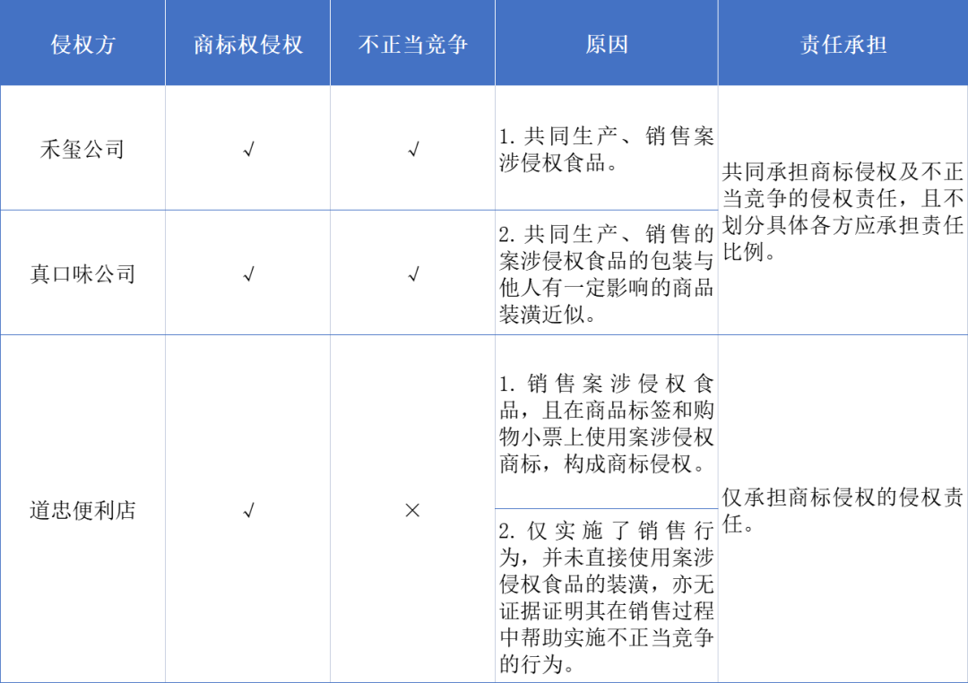 因禾玺公司和真口味公司共同实施了侵权行为,应当承担连带责任。道忠便利店与两公司不存在共同侵权的故意,应独立承担侵权责任。法院考虑到权利人株式会社龙角散的“龍角散”商标知名度较高,加上禾玺公司、真口味公司具有一定的主观故意,结合该两公司所实施的侵权行为及后果,以及权利人为制止本案侵权行为而支付的合理开支(公证费、检索费、翻译费等)等因素,酌情确定赔偿金额20万元,由两公司共同承担,不划分具体各方应承担责任比例。而道忠便利店则因构成商标侵权,需赔偿权利人株式会社龙角散经济损失和为制止侵权行为所支付的合理开支共计2,500元。