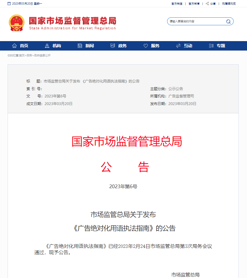 为进一步规范广告绝对化用语执法,保护自然人、法人和其他组织的合法权益,维护广告市场秩序,国家市场监督管理总局于近日发布《广告绝对化用语执法指南》(以下简称“《指南》”),旨在为市场监管部门开展广告绝对化用语监管执法提供指引,同时给自然人、法人和其他组织应如何使用广告用语提示了风险。