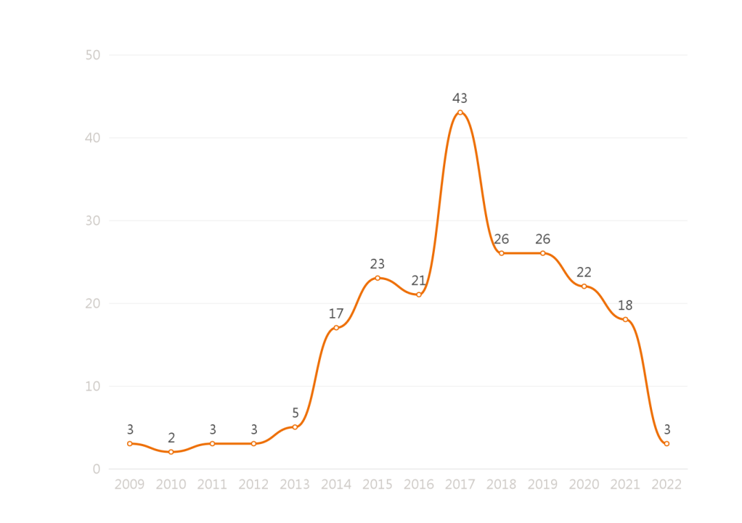 从上方的年份分布可以看到当前条件下医疗事故罪案例数量的变化趋势。(统计截至2023年5月17日)