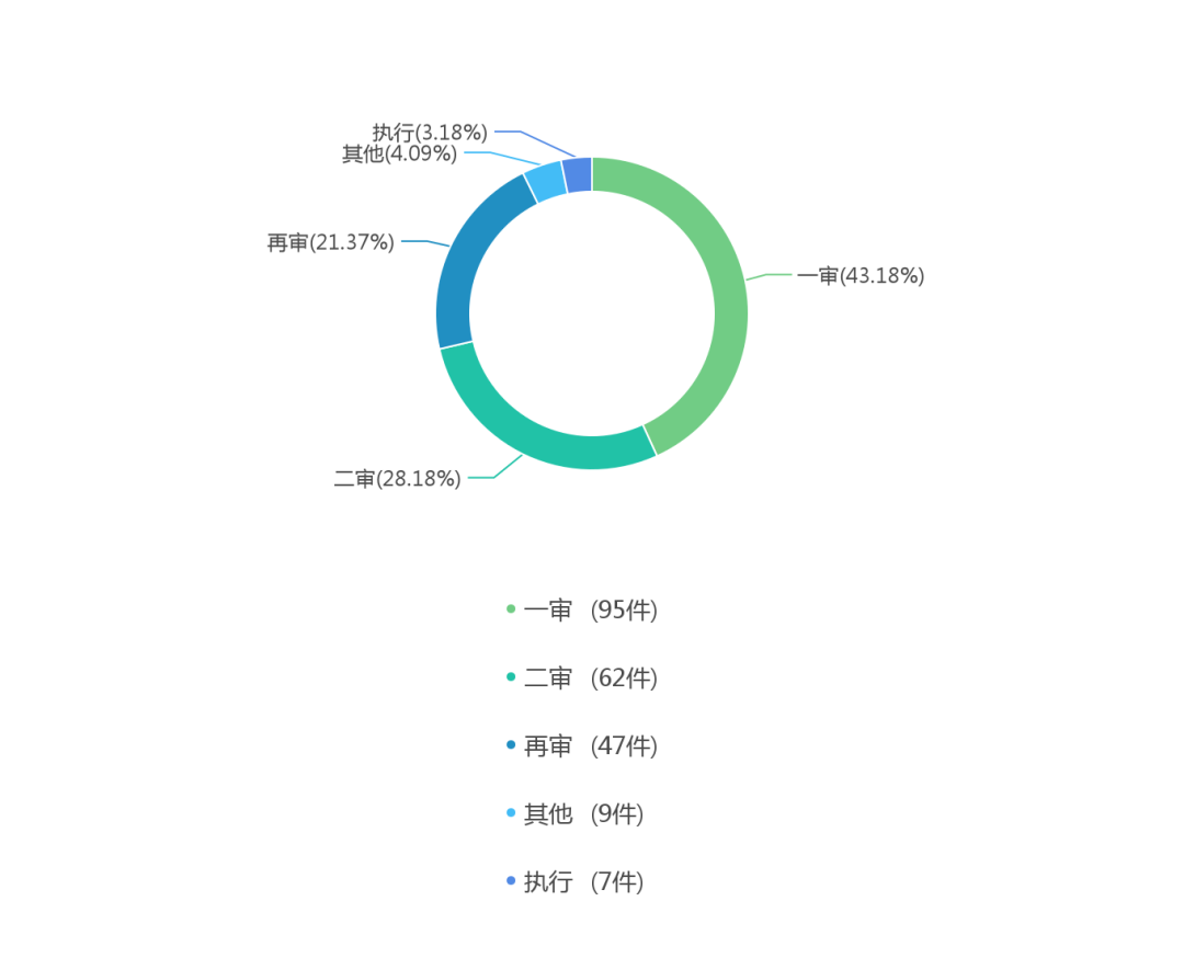 从上面的程序分类统计可以看到医疗事故罪下当前的审理程序分布状况。一审案件有95件,二审案件有62件,再审案件有47件,执行案件有7件。