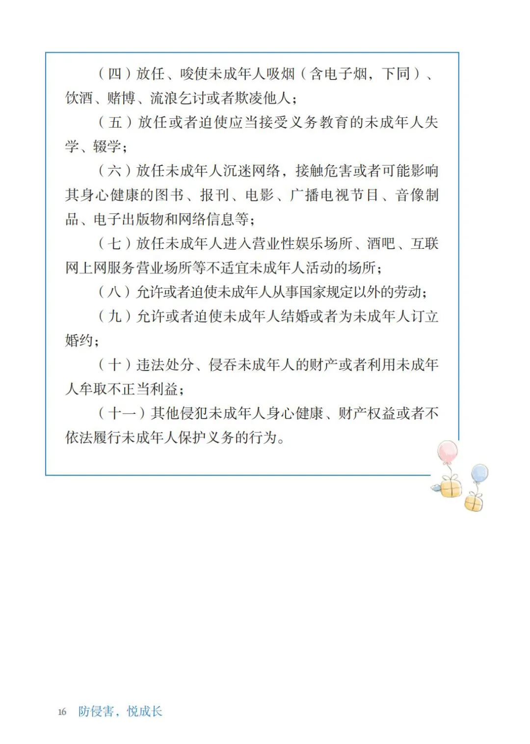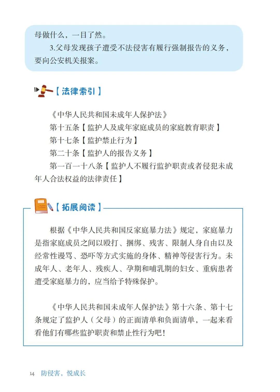 《防侵害,悦成长——未成年人保护法(新修)案例分析》以《未成年人保护法》为主线,分为总则、家庭保护、学校保护、社会保护、网络保护、政府保护和司法保护七章;通过以案说法、法护小知识、拓展阅读、观点判断以及法律检索,配以精美插图等形式,力图贴近孩子们的日常生活、学习、娱乐,让普法变得更加喜闻乐见,润物无声。