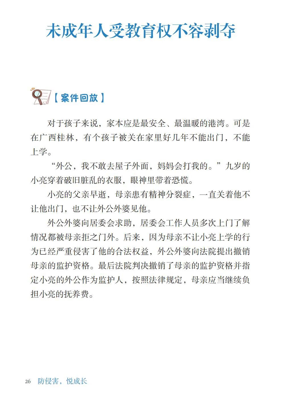 《防侵害,悦成长——未成年人保护法(新修)案例分析》以《未成年人保护法》为主线,分为总则、家庭保护、学校保护、社会保护、网络保护、政府保护和司法保护七章;通过以案说法、法护小知识、拓展阅读、观点判断以及法律检索,配以精美插图等形式,力图贴近孩子们的日常生活、学习、娱乐,让普法变得更加喜闻乐见,润物无声。