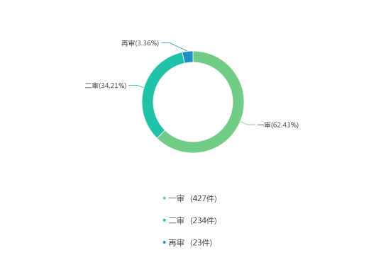 从上面的程序分类统计可以看到当前的审理程序分布状况。一审案件有427件,占比62.43%;二审案件有234件,占比34.21%;再审案件有23件,占比3.36%。