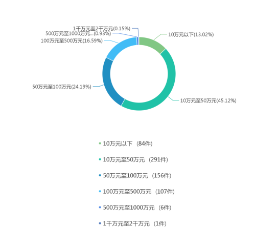 通过对标的额的可视化分析可以看到,标的额为10万元至50万元的案件数量最多,有291件,10万元以下的案件有84件,50万元至100万元的案件有156件,100万元至500万元的案件有107件,500万元至1000万元的案件有6件,1千万元至2千万元的案件有1件。