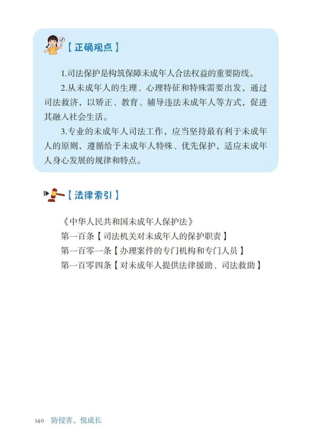 《防侵害,悦成长——未成年人保护法(新修)案例分析》以《未成年人保护法》为主线,分为总则、家庭保护、学校保护、社会保护、网络保护、政府保护和司法保护七章;通过以案说法、法护小知识、拓展阅读、观点判断以及法律检索,配以精美插图等形式,力图贴近孩子们的日常生活、学习、娱乐,让普法变得更加喜闻乐见,润物无声。