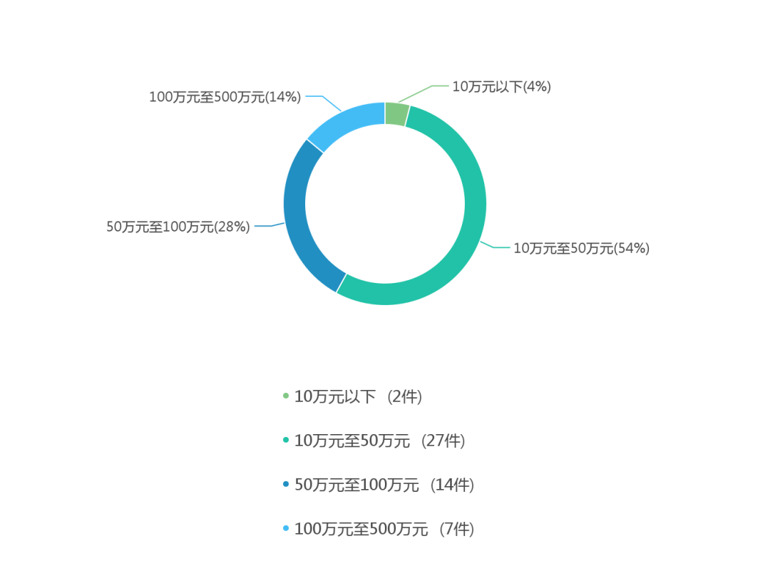 通过对判赔额的可视化分析可以看到,判赔额为10万元至50万元的案件数量最多,有27件。其次为50万元至100万元的案件有14件,100万元至500万元的案件有7件,10万元以下的案件有2件。