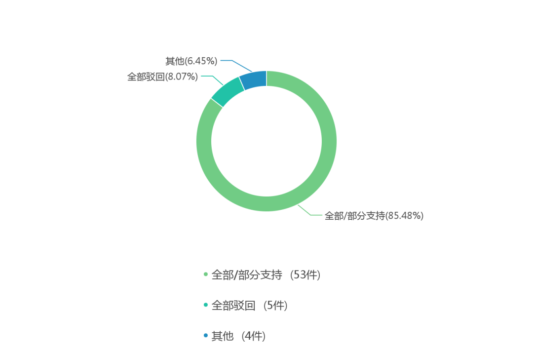 通过对一审裁判结果的可视化分析可以看到,当前条件下全部/部分支持的有53件,占比为85.48%;全部驳回的有5件,占比为8.06%;其他的有4件,占比为6.45%。
