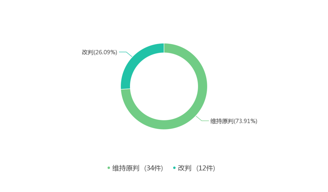 通过对二审裁判结果的可视化分析可以看到,维持原判的有34件,占比为73.91%;改判的有12件,占比为26.09%。