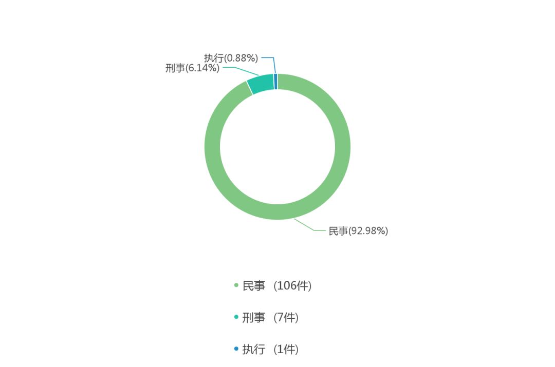 从案由分类情况可以看到,当前最主要的案由是民事,有106件,占一半以上,其次是刑事,执行。