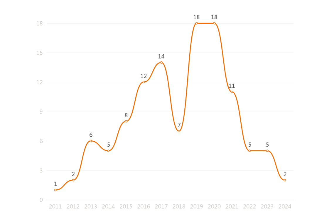 从上方的年份分布可以看到当前条件下案例数量的变化趋势。