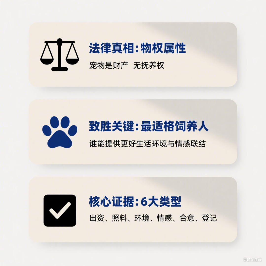 争取宠物所有权不仅需要“财产证据”(如购买凭证、医疗记录),更需要大量“情感证据”(如日常照护记录、情感互动),构建一个多维度的证据体系,以支持“最适格饲养人”的主张,弥补法律仅将其视为财产的不足。