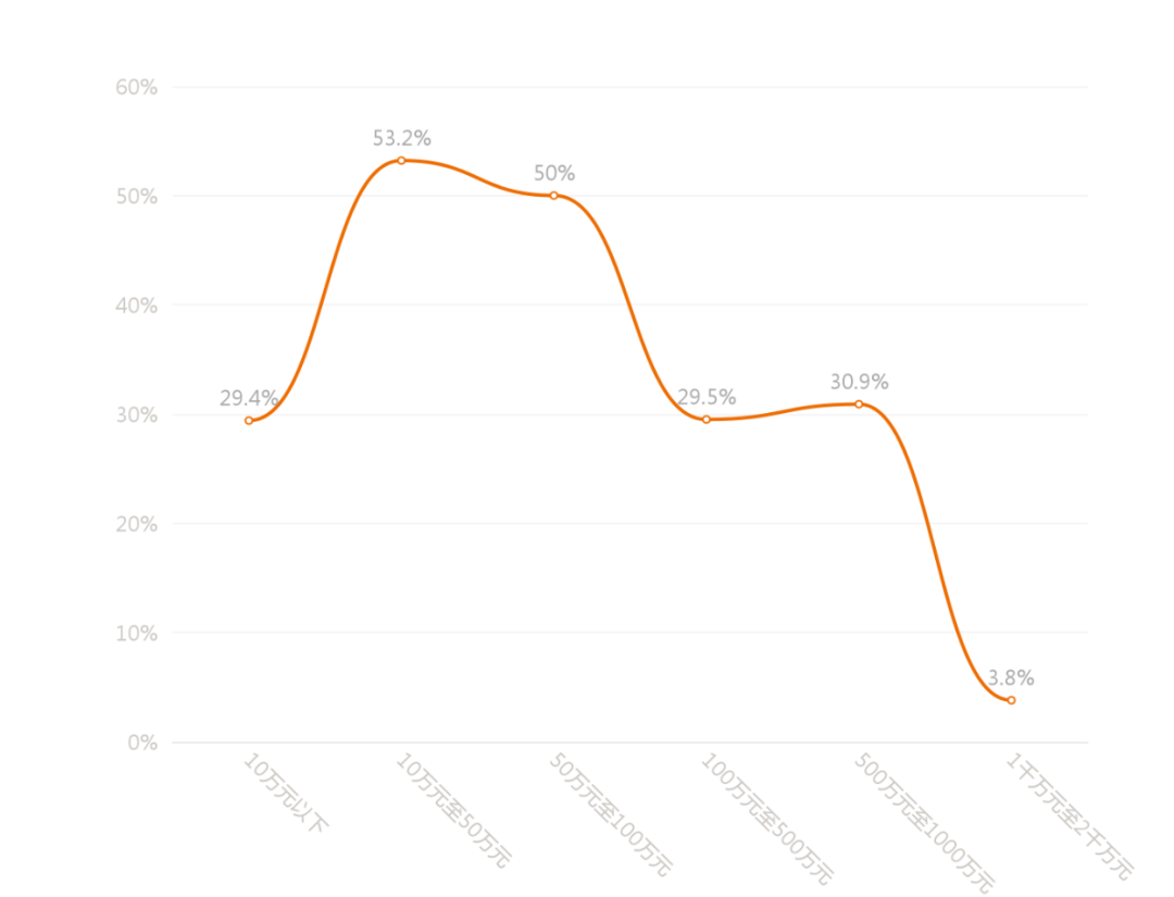 通过对诉请支持率的可视化分析可以看到,诉请支持率为10万元至50万元的案件,诉请支持率最高,为53.2%,50万元至100万元的案件,诉请支持率为50.0%,500万元至1000万元的案件,诉请支持率为30.9%,100万元至500万元的案件,诉请支持率为29.5%,10万元以下的案件,诉请支持率为29.4%。