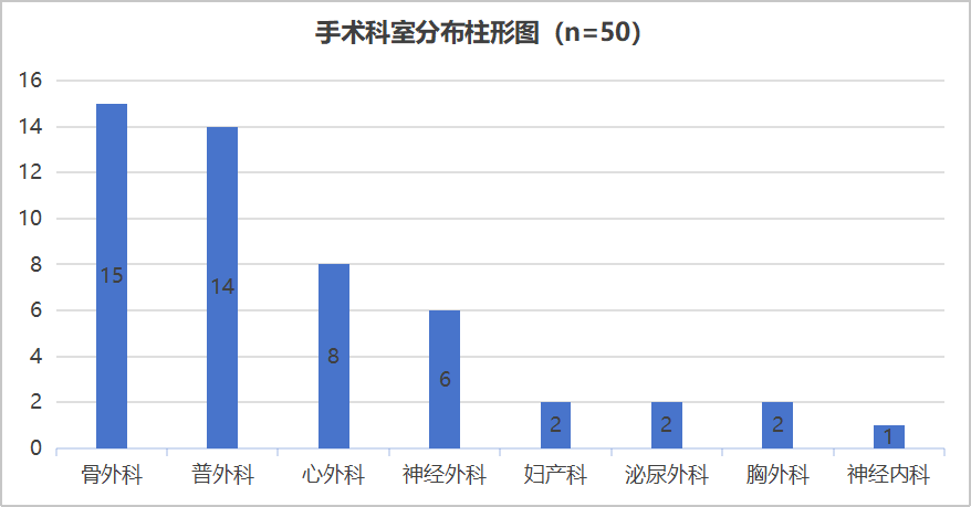 笔者选取了50篇相关性最高的案例统计涉案手术所属科室,可以看到频数排名前三的科室为骨外科(15例)、普外科(14例)、心外科(8例)。15例骨外科手术中含脊柱外科7例、关节外科3例、创伤外科3例、其他骨外科手术2例。14例普外科手术中含胃肠外科6例、肝胆胰外科6例、其他普外科手术2例。科室分布的特点可能与疾病类型、手术特点有关,也可能与手术量有关。