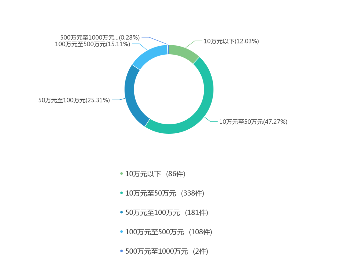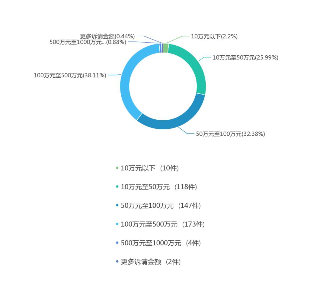通过对诉请金额的可视化分析可以看到,诉请金额为10万元以下的案件数量最多,有10件,10万元至50万元的案件有118件,50万元至100万元的案件有147件,100万元至500万元的案件有173件,500万元至1000万元的案件有4件,1千万元至2千万元的案件有2件。