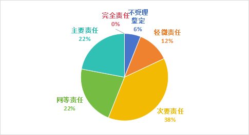 笔者从本次检索到的743篇案例中选取了相关性最高的50篇案例统计了法院判决的责任比例,通过上面的图表可得知,涉及术后感染性休克死亡的医疗损害责任纠纷中,医方承担次要责任的比例最大,占比38%;承担同等责任和主要责任的也有相当一部分,分别占比22%。50篇案例中未见无责任或完全责任。当然,具体到个案的责任情况不能一概而论,还是需要根据具体案情进行评估。
