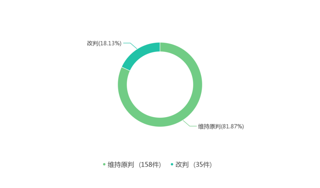 通过对二审裁判结果的可视化分析可以看到,当前条件下维持原判的有158件,占比为81.87%;改判的有35件,占比为18.13%。