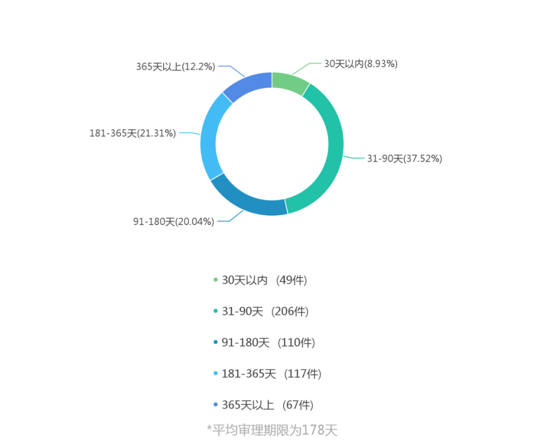通过对审理期限的可视化分析可以看到,当前条件下的审理时间更多处在31~90天的区间内,平均时间为178天。