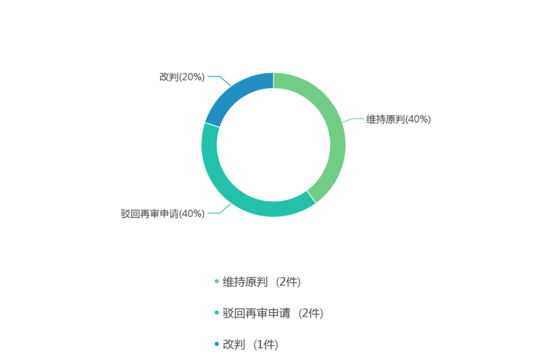 通过对再审裁判结果的可视化分析可以看到,当前条件下维持原判的有2件,占比为40.00%;驳回再审申请的有2件,占比为40.00%;改判的有1件,占比为20.00%。