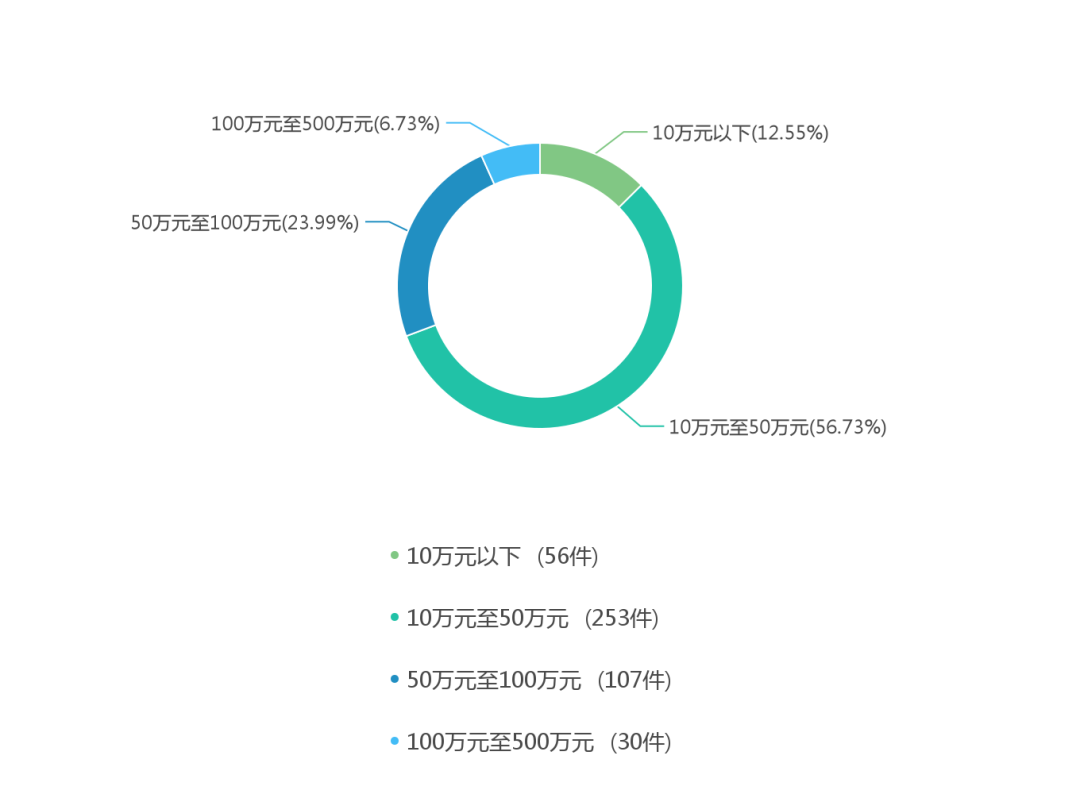 通过对判赔额的可视化分析可以看到,判赔额为10万元至50万元的案件数量最多,有253件,50万元至100万元的案件有107件,10万元以下的案件有56件,100万元至500万元的案件有30件。