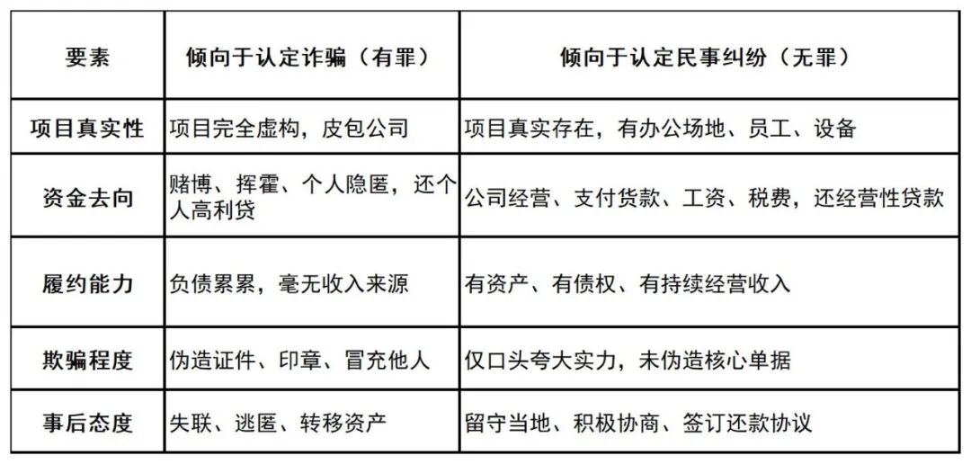 安全区公式:虚构事实+有偿还意愿+资金用于经营+积极协商=民事纠纷/民事欺诈。