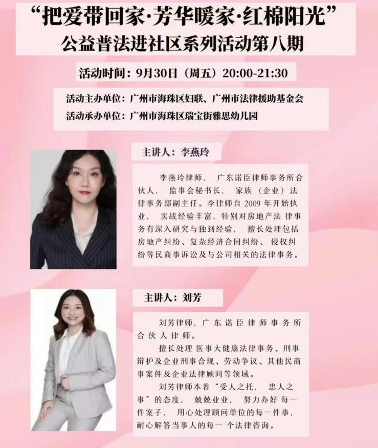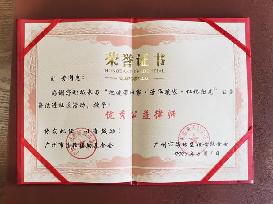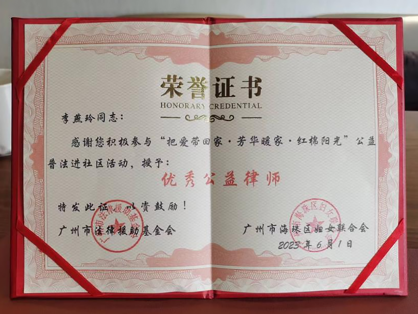 2023年6月1日,由广州市法律援助基金会、广州市海珠区妇女联合会主办,海珠区瑞宝街雅思幼儿园承办的“把爱带回家·芳华暖家·红棉阳光”公益普法进社区系列活动总结表彰大会圆满举行,广东诺臣律师事务所合伙人李燕玲律师、刘芳律师受邀出席,并获颁“优秀公益律师”荣誉证书。