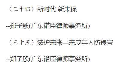 近日,广州律协举办的“2022年广州律师业务技能优质课评选大赛”正式公布结果。按照评选程序,市律协对全市申报课件组织了评审,共评选出51个优质课及13名优秀讲师,其中广东诺臣律师事务所高级合伙人郑子殷律师的《新时代 新未保》、《法护未来—未成年人防侵害》两个课件均获评为优质课。