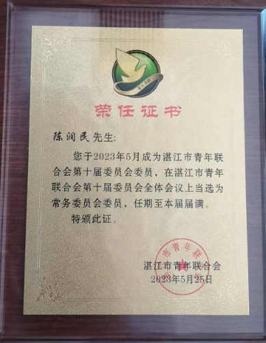 2023年5月24日至25日,湛江市青年联合会第十届委员会全体会议在湛江国际会展中心举行。会议深入学习贯彻党的20大精神和习近平总书记视察广东重要讲话重要指示精神,总结湛江市青联六年来的工作,研究确定未来五年的工作任务,选举产生了市青联新一届领导机构,诺臣律师陈润民当选第十届湛江市青年联合会常委。
