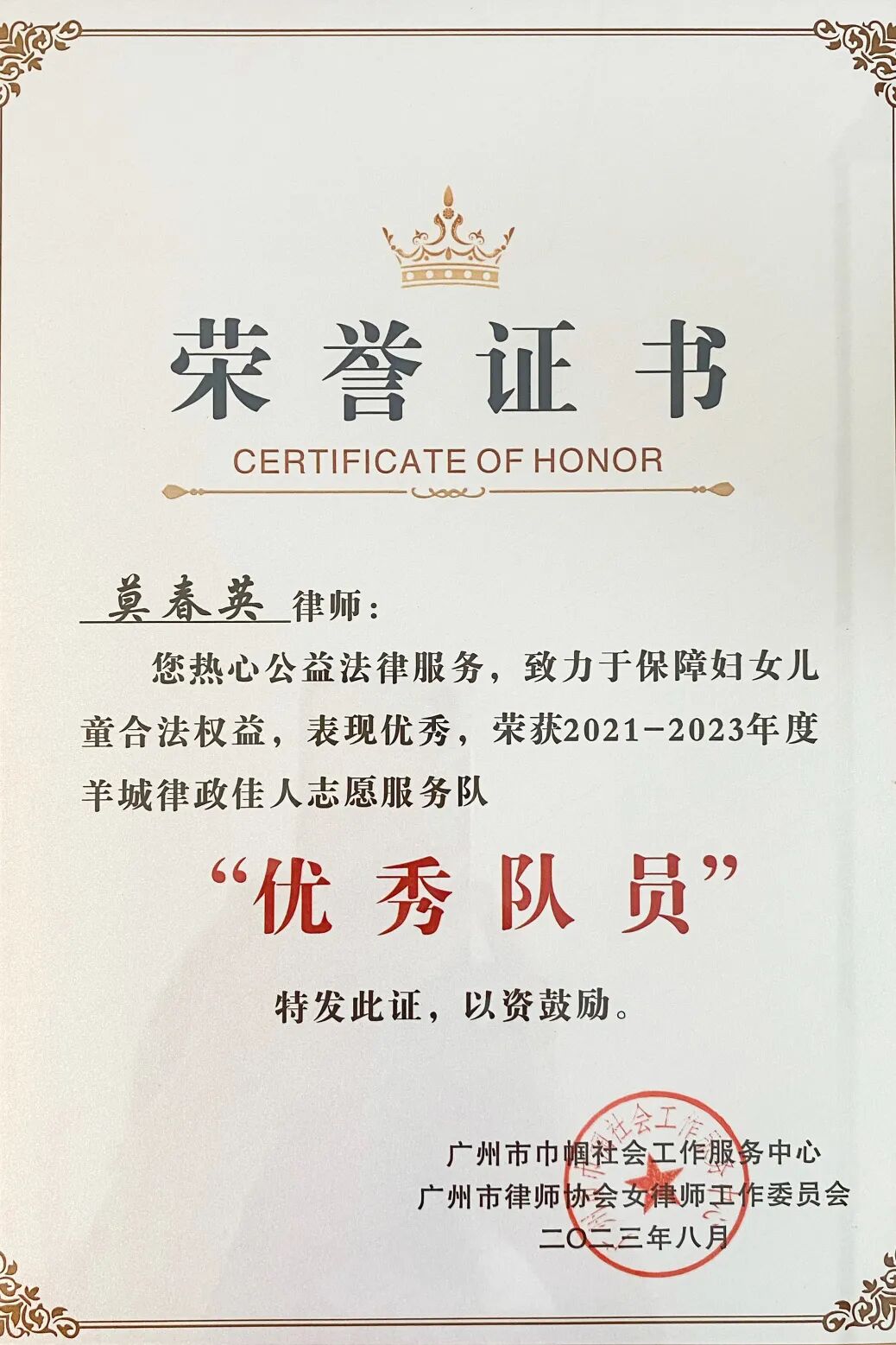 曾荣获2015年度、2017年度、2021年度广州市律师协会颁发“业务成果奖”;2011年6月荣获广州市亚组委颁发“广州亚运会、亚残运会志愿者先进个人”以及广州市红十字会颁发的“先进个人”等。