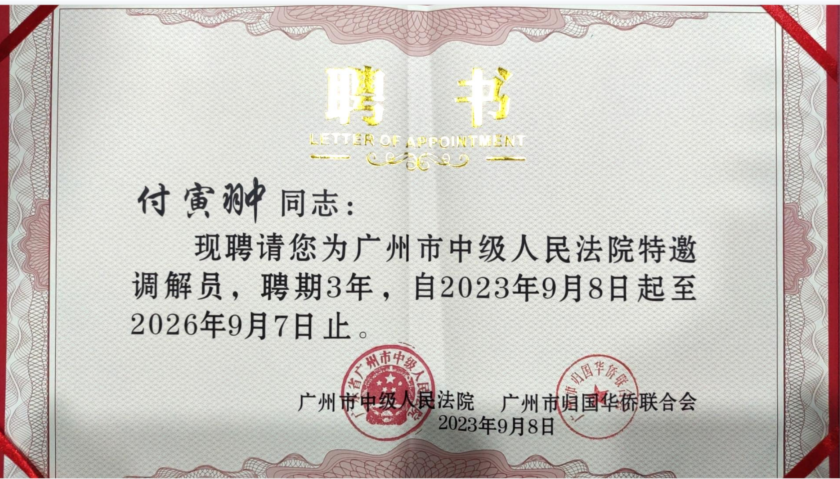 付寅翀律师作为广州侨联法律顾问委员会委员,在房地产、公司法律事务、复杂民商事诉讼等领域拥有深厚的理论基础与丰富的实践经验。在此次会议中,付寅翀律师获聘广州市中级人民法院特邀调解员,参与涉侨纠纷调解工作,是为广州市涉侨领域矛盾纠纷多元化解机制的建设与落成贡献专业力量。