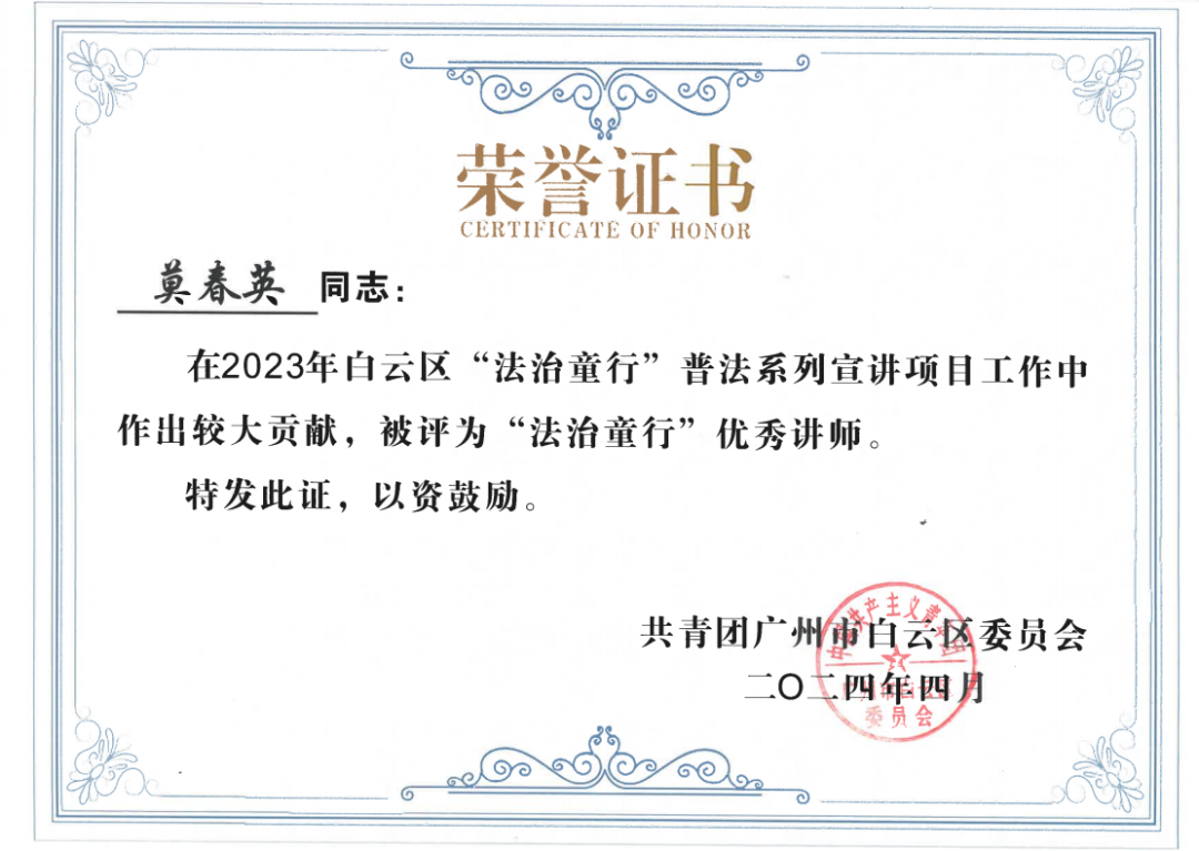 2023年,由共青团广州市白云区团委主办的2022-2023年度“法治童行”普法系列宣讲项目在白云区面向中小学开展60场校园普法宣讲,截止到2023年11月20日,已完成60场,分别面向小学开展37场、中学开展23场。本次宣讲范围涉多个街镇,共计12061人受益。其中,周倩仪律师为全区开展17场校园普法宣讲、莫春英律师为全区开展8场宣讲,黎嘉敏律师为全区开展6场宣讲,为6000多名学生送上精彩普法讲座,获得学校师生的一致好评。