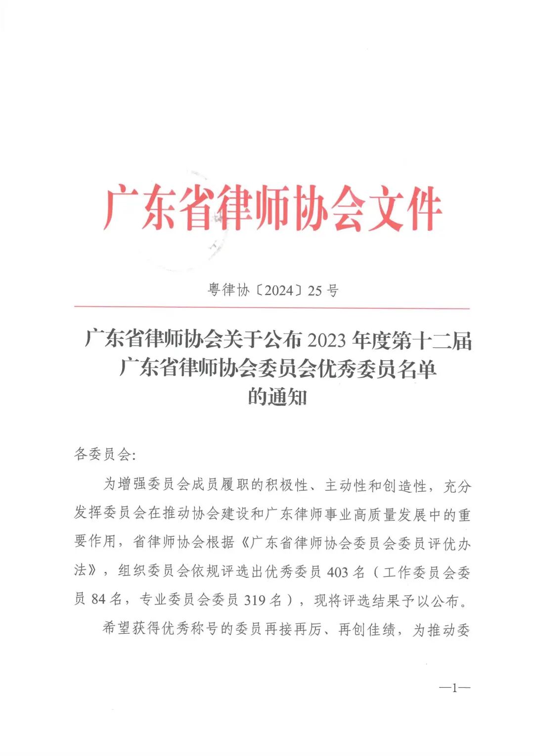 为增强委员会成员履职的积极性、主动性和创造性,充分发挥委员会在推动协会建设和广东律师事业高质量发展中的重要作用,省律师协会根据《广东省律师协会委员会委员评优办法》,组织委员会依规评选出优秀委员403名(工作委员会委员84名,专业委员会委员319名),并于近日将评选结果予以公布。广东诺臣律师事务所共有8名律师获评优秀委员,其中王静律师获评“工作委员会优秀委员”荣誉称号,黄家章律师(白云分所)、陈舒媚律师、李艺律师、罗剑文律师、邓见平律师、李燕玲律师、陈冰华律师获评“专业委员会优秀委员”荣誉称号。