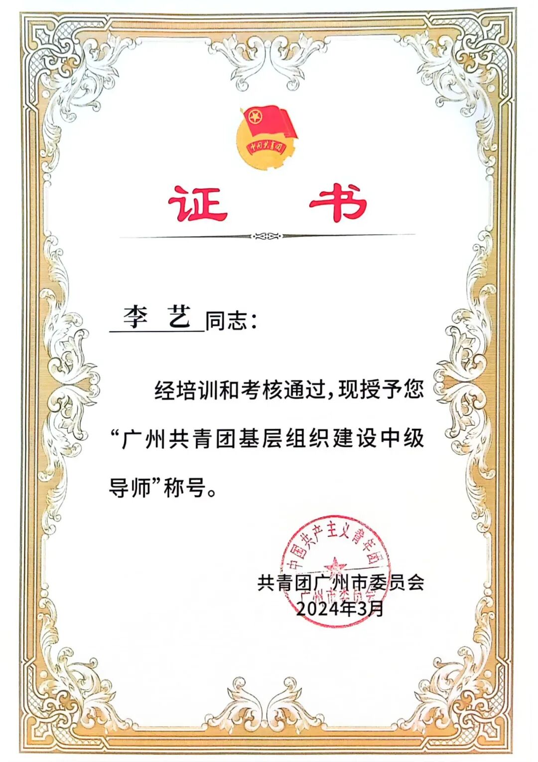 为深入学习贯彻党的二十大精神,全面贯彻落实习近平总书记关于青年工作的重要思想和习近平总书记在同团中央新一届领导班子成员集体谈话时的重要讲话精神,全面落实团十九大部署,根据《干部教育培训工作条例》《中国共产主义青年团干部教育培训工作条例》和《全国团干部教育培训规划(2024-2028年)》等文件精神,结合广州共青团工作实际,共青团广州市委员会组织开展“基层团建导师百人计划”,经各直属团组织推荐、团市委资料筛选审核、培育实训及团市委书记班子研究等程序,于近日颁发证书。其中,广东诺臣律师事务所监事会监事、一级合伙人李艺律师于2023年11月获评“广州共青团基层组织建设初级导师”称号,并于2024年3月获评“广州共青团基层组织建设中级导师”称号。