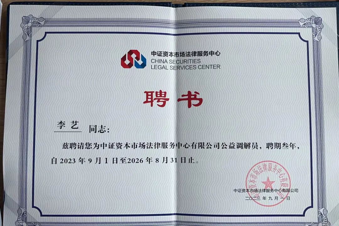 作为公益调解员,李艺律师将充分发挥其专业知识和实践经验,为投资者提供高效、优质的服务,助力证券期货纠纷多元解纷,尽力为资本市场健康稳定发展做出贡献。