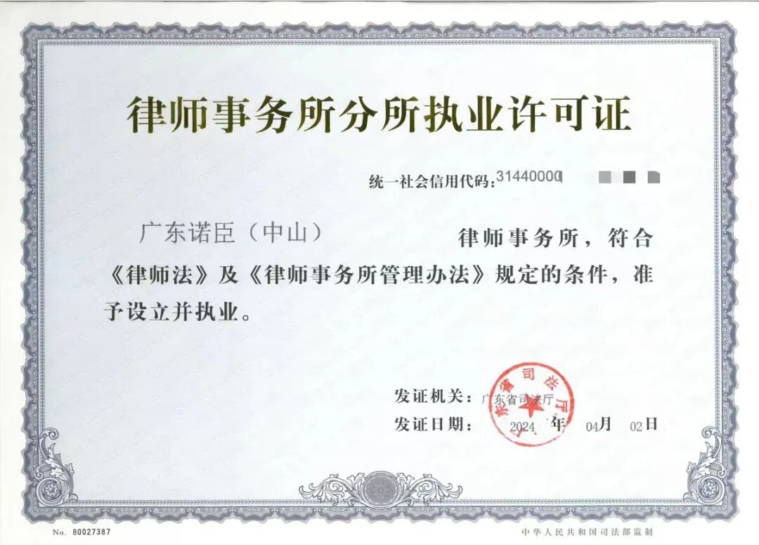 在广东诺臣律师事务所(以下简称诺臣总所)大力支持和广东诺臣(中山)律师事务所(以下简称中山分所)创办人的不懈努力下,2024年4月2日,经广东省司法厅批准,广东诺臣(中山)律师事务所执业许可获批通过,广东诺臣(中山)律师事务所正式成立。这是诺臣总所的第三家分所,标志着诺臣律所辐射湾区迈出了重要的一步。