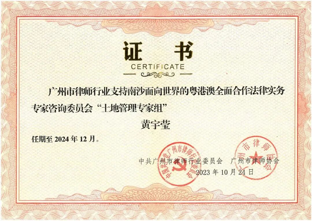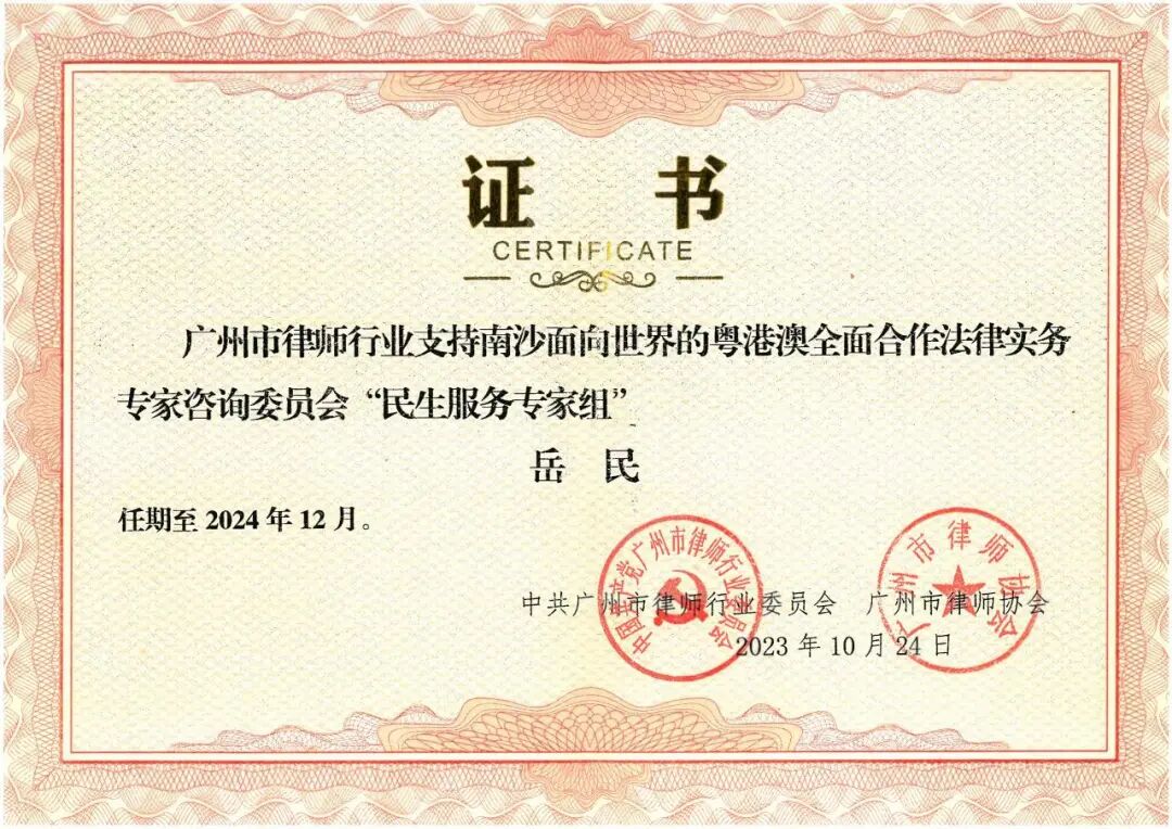 自《南沙方案》发布以来,重大政策接连落地,重大项目相继启动,对于专业法律服务的需求与日俱增。为服务保障南沙高质量发展,在广州市司法局的指导下,广州市律师协会组建广州市律师行业支持南沙面向世界的粤港澳全面合作法律事务专家咨询委员会,广州律师行业支持南沙法律事务专家咨询委员会由15个法律专家组组成,其中广东诺臣律师事务所(以下简称“诺臣所”)监事会副主席、高级合伙人胡东律师入选“解决商事纠纷专家组”,合伙人黄宇莹律师入选“土地管理专家组”,合伙人岳民律师入选“民生服务专家组”。