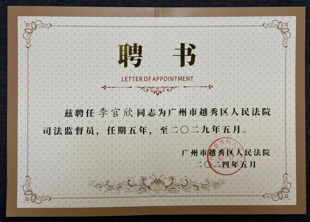 聘任仪式上,广东诺臣律师事务所合伙人李官欣律师律师受邀为广州市越秀区人民法院司法监督员,任期五年。本次获聘的15位司法监督员来自各行各业,包括越秀区政协领导、区司法局负责人和商业教育、医疗、物流等行业的领军企业家。