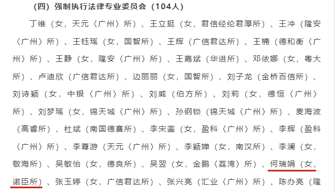 为进一步加强省律协委员会建设,充实委员会队伍,推进广东律师事业发展,根据《广东省律师协会章程》和《关于增补第十二届广东省律师协会部分委员会委员的通知》的相关规定和要求,省律协于今年上半年开展了部分委员会的增补委员工作。经严格的申报、审核及遴选程序,并经会长办公会审议,确定了涉及14个工作委员会和38个专业委员会的增补委员名单,其中广东诺臣律师事务所合伙人冯小玲律师入选职务犯罪辩护专业委员会,合伙人王子晴律师入选物业管理法律专业委员会,合伙人何瑞娟律师入选强制执行法律专业委员会。