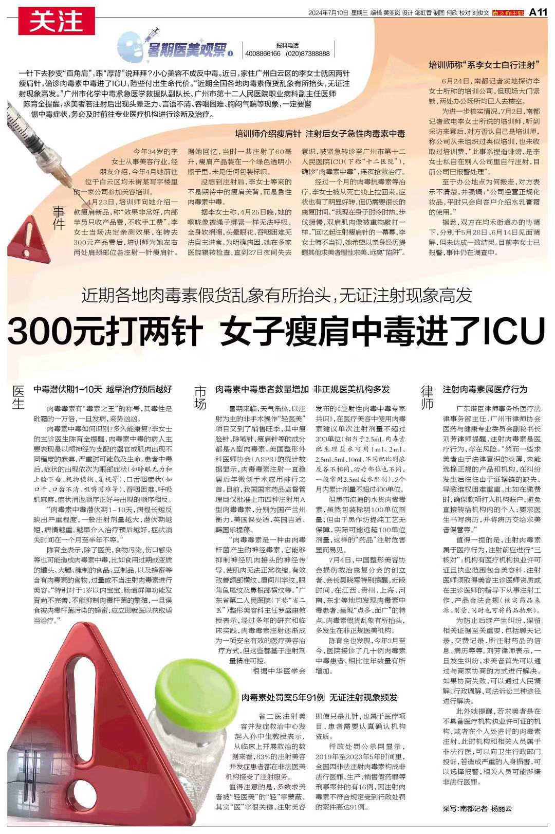 近日,家住广州白云区的李女士就因两针瘦肩针,确诊肉毒素中毒进了ICU,险些付出生命代价。不止如此,近期全国各地肉毒素假货乱象有所抬头,无证注射现象高发。2024年7月3日,广东诺臣律师事务所(以下简称“诺臣所”)医疗与健康法律事务部主任、合伙人刘芳律师接受南方都市报采访,就注射肉毒素应注意事项提出了专业的法律意见。