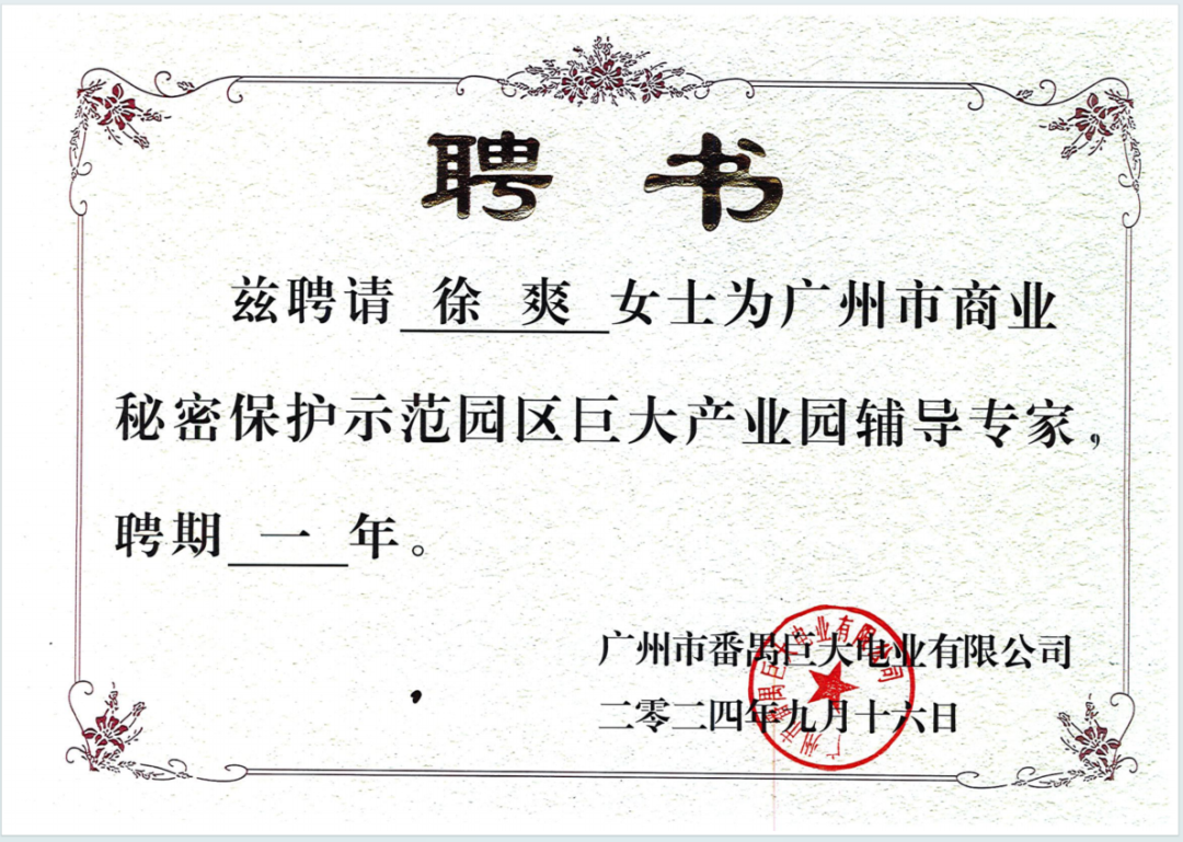 2024年7月,为深入贯彻党中央、国务院关于加强商业秘密保护的决策部署,在广州市、番禺区市场监督管理局的指导下,巨大创意产业园获得广州市市场监督管理局批准建设“广州市商业秘密保护示范园区”项目,成为优化营商环境、促进企业创新的示范引领者。为助力园区企业在商业秘密保护方面的法律专业服务,2024年9月16日,广州市番禺巨大电业有限公司聘请广东诺臣律师事务所徐爽律师担任广州市商业秘密保护示范园区巨大产业园辅导专家,聘期一年。