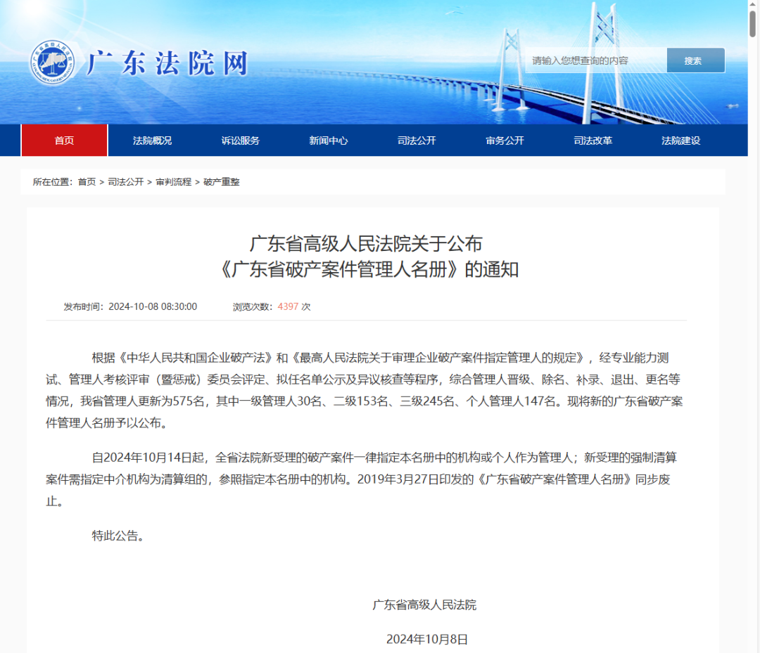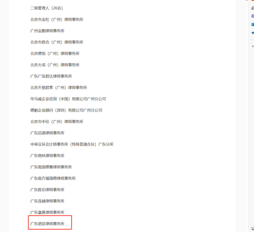 2024年10月8日,广东省高级人民法院发布关于《广东省高级人民法院关于公布<广东省破产案件管理人名册>的通知》,经各中级人民法院及省法院考核评审委员会的严格审查与考核,广东省管理人更新为575名,其中广州市二级管理人26名,广东诺臣律师事务所(以下简称“诺臣所”)成功入选二级管理人名册。