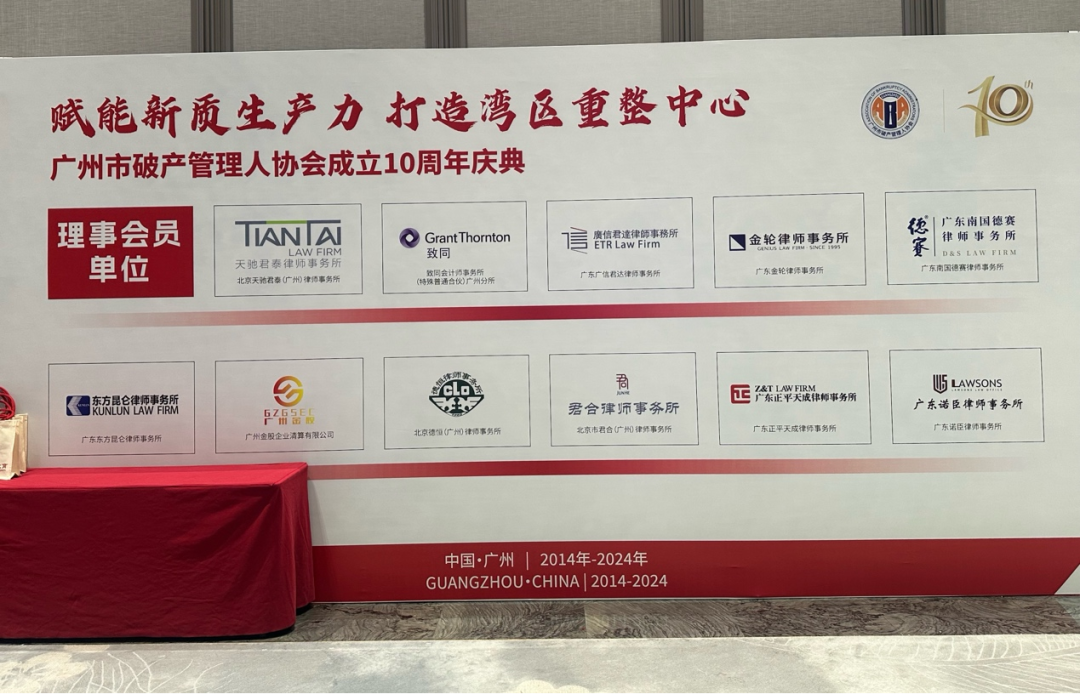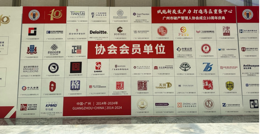 星光璀璨,共贺十载,2024年10月18至19日,广州市破产管理人协会成立十周年庆典在广州白云国际会议中心隆重举行。广东诺臣律师事务所作为广州市破产管理人协会理事会员单位,派出我所破产清算法律事务部主任胡东律师,副主任麦佳耀律师、罗剑文律师、车天驰律师,秘书长王晓盈律师代表出席庆典活动。
