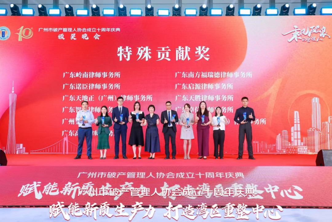 凭借出色的专业实力以及多年的深厚积淀,广东诺臣律师事务所荣获广州市破产管理人协会成立十周年庆典特殊贡献奖。