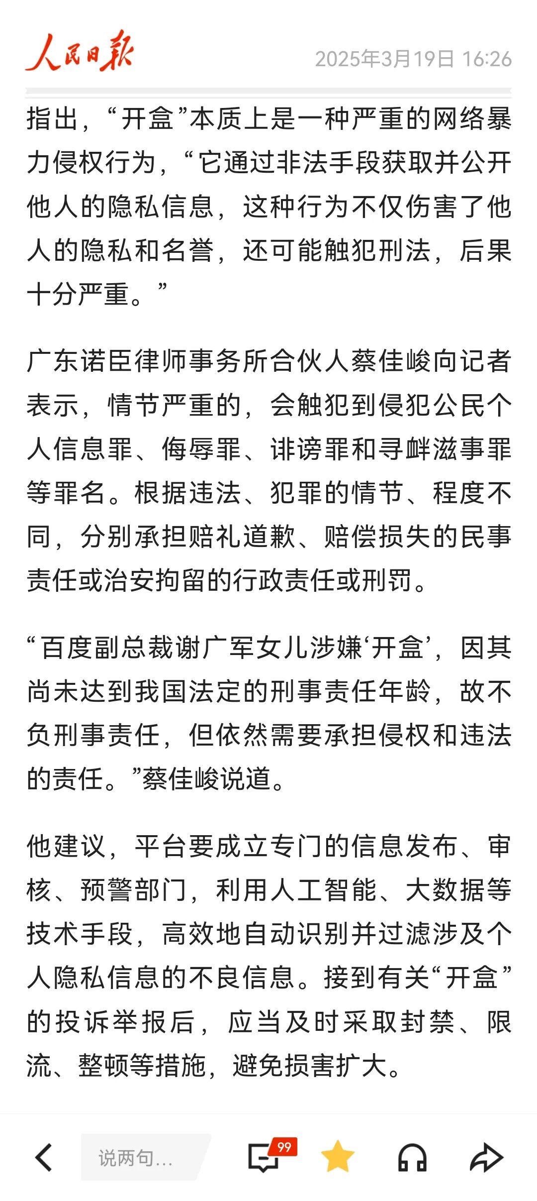 蔡佳峻律师指出,关于“人肉开盒”行为,情节严重的,会触犯到侵犯公民个人信息罪、侮辱罪、诽谤罪和寻衅滋事罪等罪名。根据违法、犯罪的情节、程度不同,分别承担赔礼道歉、赔偿损失的民事责任或治安拘留的行政责任或刑罚。“百度副总裁谢广军女儿涉嫌‘开盒’,因其尚未达到我国法定的刑事责任年龄,故不负刑事责任,但依然需要承担侵权和违法的责任。”